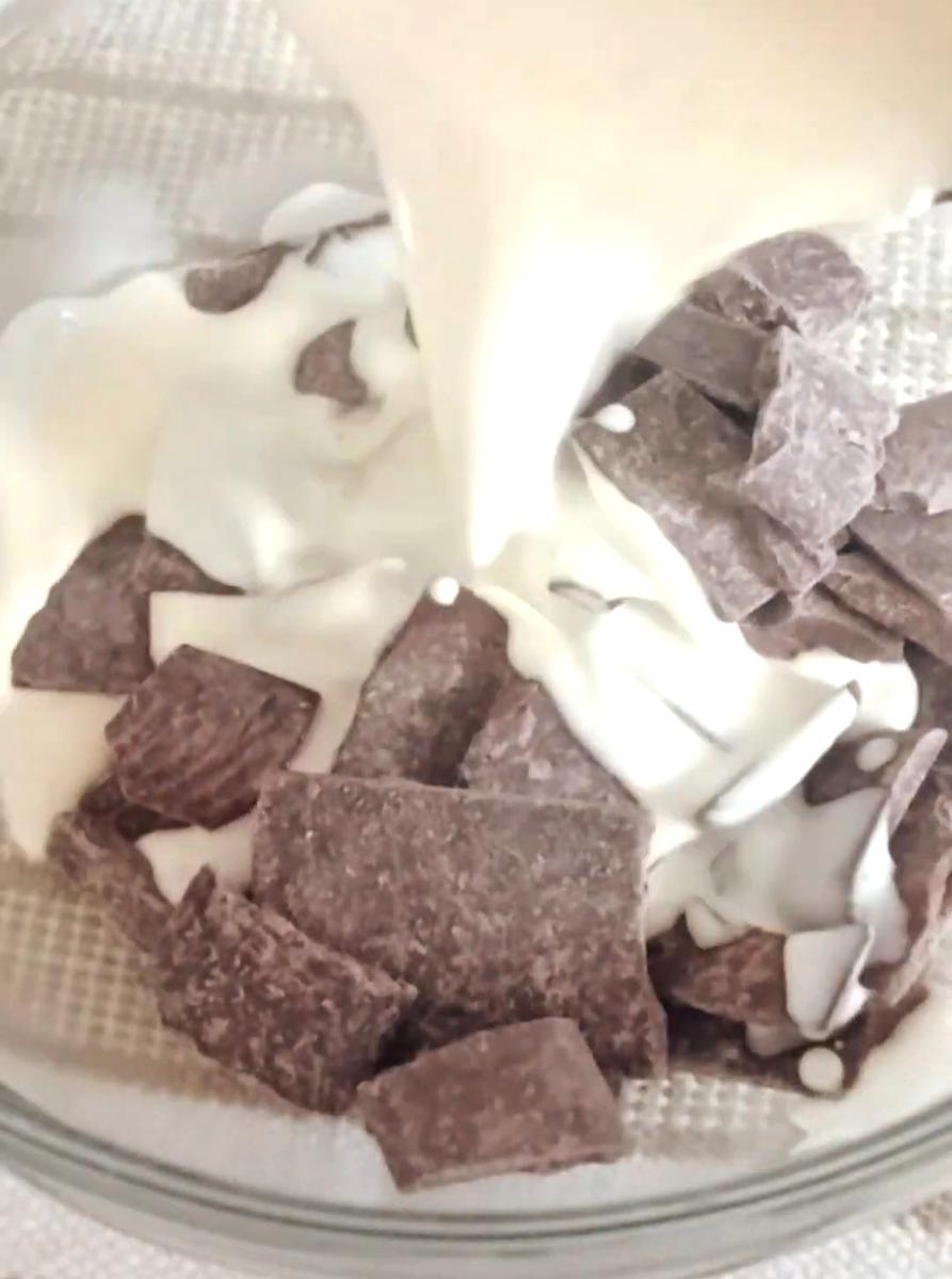 5- Hacer la ganache, calentando la crema y volcando sobre el chocolate picado, dejar reposar y mezclar.