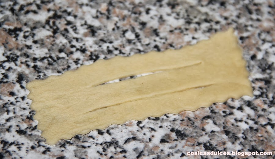 Liamos la masa en papel film y la dejamos reposar unos 60 minutos. No se producirá ningún levado pero nos será mucho más fácil trabajarla después. Transcurrido este tiempo tomamos una parte de la masa y la estiramos muy fina (casi transparente): Lo ideal es usar una maquina de hacer pasta pero si no tenemos tampoco pasa nada. Cortamos rectángulos de masa y les hacemos. dos cortes en el centro.