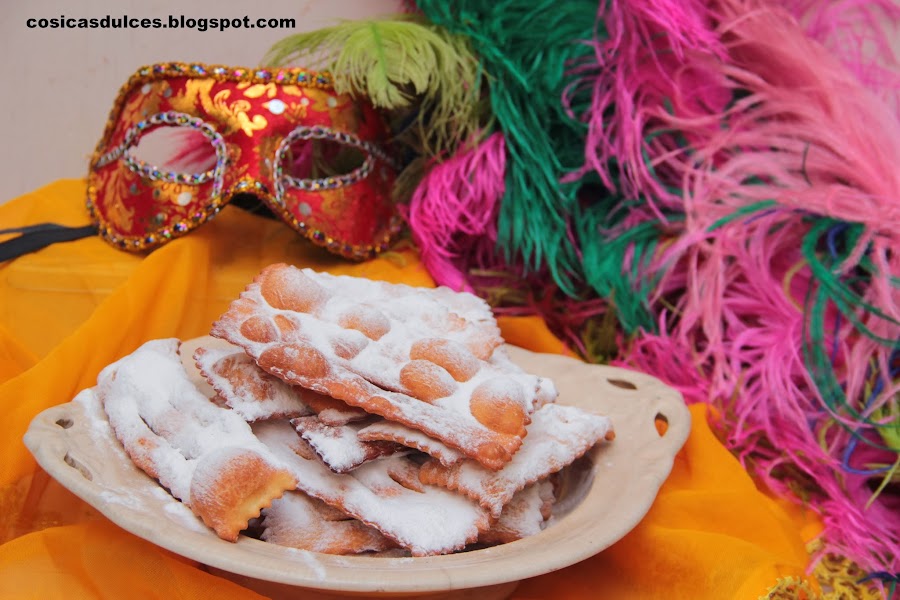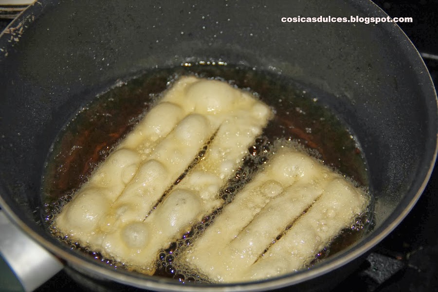 Seguidamente los freimos en aceite de oliva suave. Esta es su forma original pero también estás deliciosos si en lugar de hacer los cortes les ponemos una cucharada de crema de cacao y los doblamos como empanadillas.