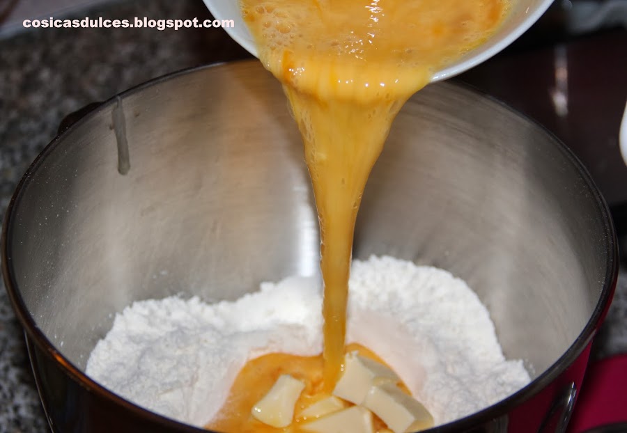 Colocamos en un bol la harina, la levadura, la sal, el azúcar, la ralladura de limón y la harina avainillada y mezclamos bien. Formamos un volcán y añadimos en el centro la mantequilla en pomada, el anís, y los huevos ligeramente batidos. Si disponemos de una amasadora dejamos trabajar durante diez minutos. Si no la tenemos amasamos a mano hasta obtener una masa bien durita.
