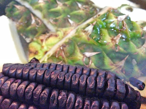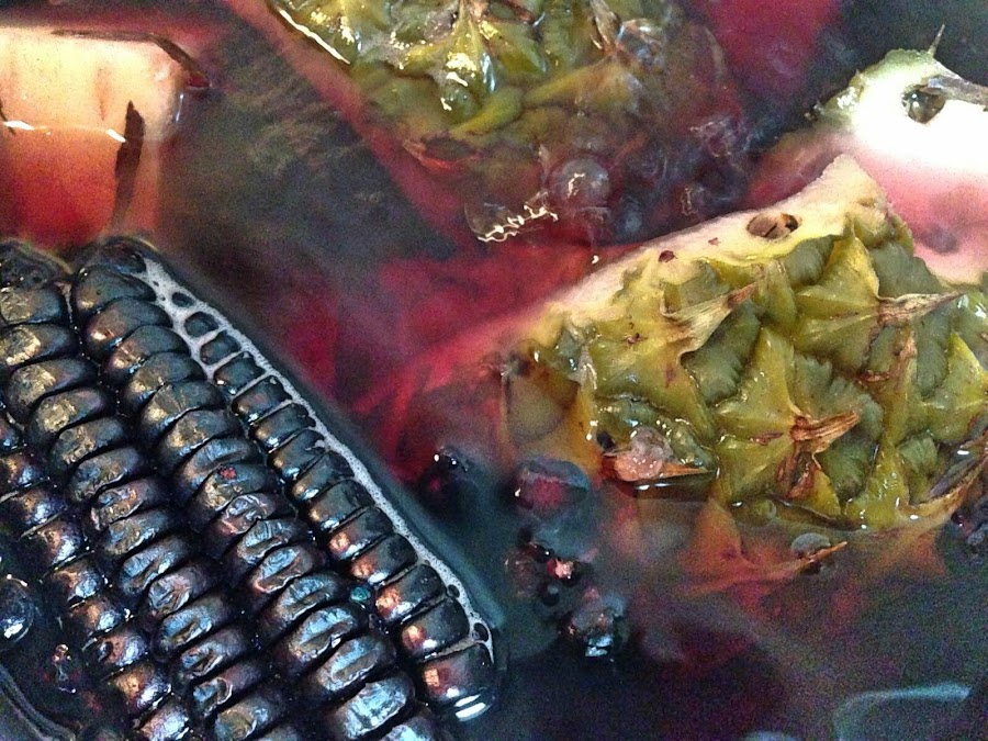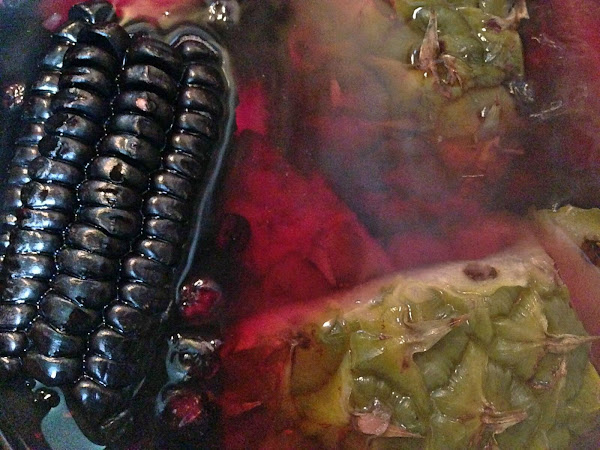 1.- En una olla añadir las cáscaras y centro de piña junto con el maíz (entero) y las especias, con 2 litros de agua. Poner a hervir.