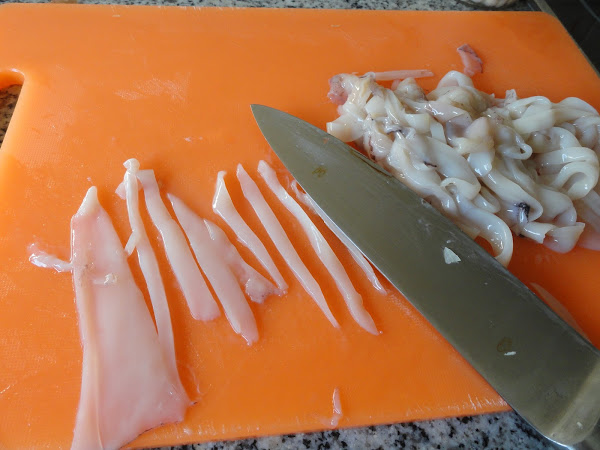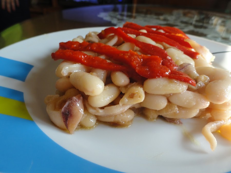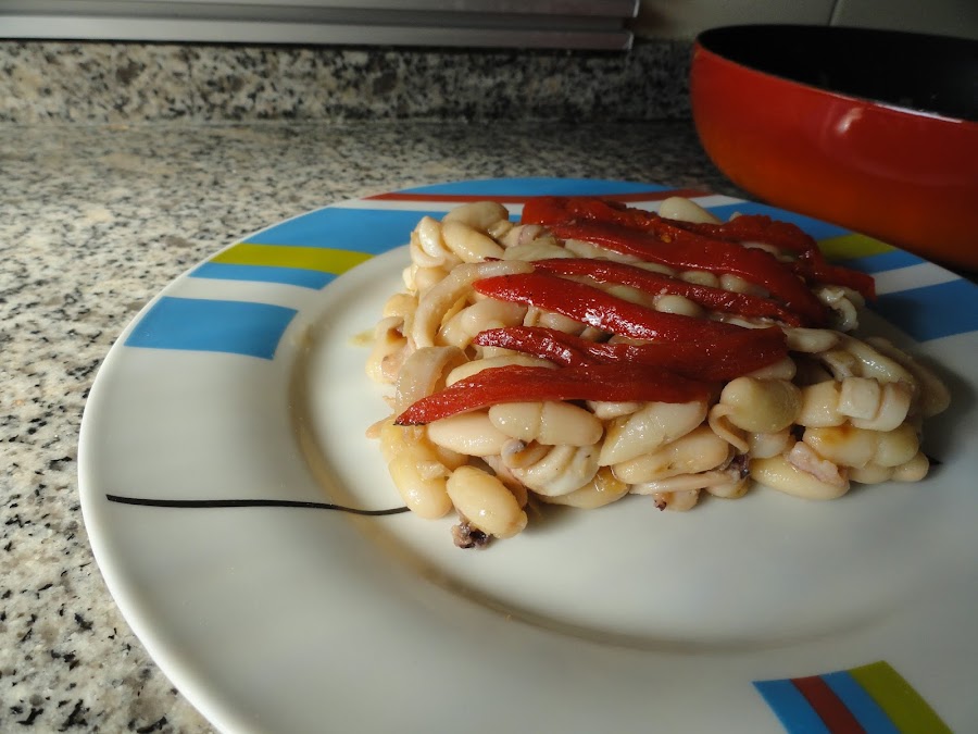 pimientos de piquilloPonemos a pochar la cebolla cortada en cuadraditos pequeños hasta que quede doradita. En la misma sartén agregamos los chipirones limpios y cortados en tiritas lo más finas posibles. para que se hagan en poco tiempo, porque las alubias ya están cocidas. Dejamos hacer unos minutos y agregamos las alubias, salpimentamos y echamos la cucharada de vinagre. Dejamos todo junto hasta que evapora el vinagre y reservamos. Aparte pasamos vuelta y vuelta los pimientos de piquillo y los troceamos para ponerlos por encima. Y hasta aquí la receta de las "ches" de chícharos y chipirones. Una forma diferente de comer chícharos.