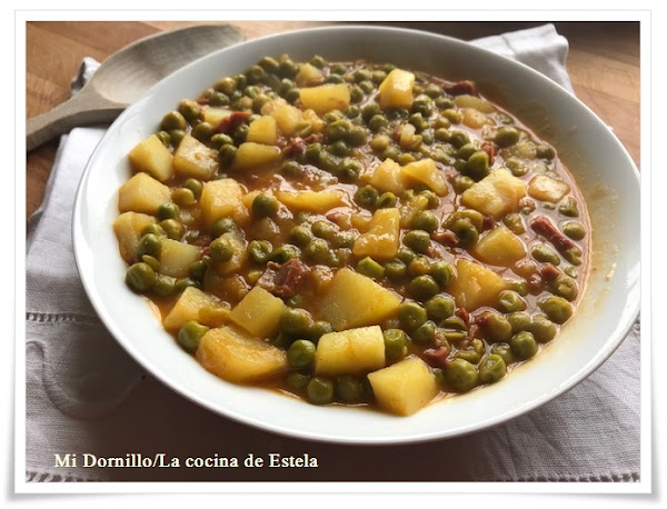 Le añadimos un poco de caldo y los taquitos de jamón, después las patatas a taquitos. Rehogar todo y salpimentar. Ponemos el caldo de verdura o agua que cubra bien todo. Cocemos unos 10/15 min y añadimos los Chícharos o guisantes, que al ser frescos tardan poco en cocer, como unos cinco minutos mas. Si los pones congelado poner con las patatas. Dejar hasta que este todo tierno.