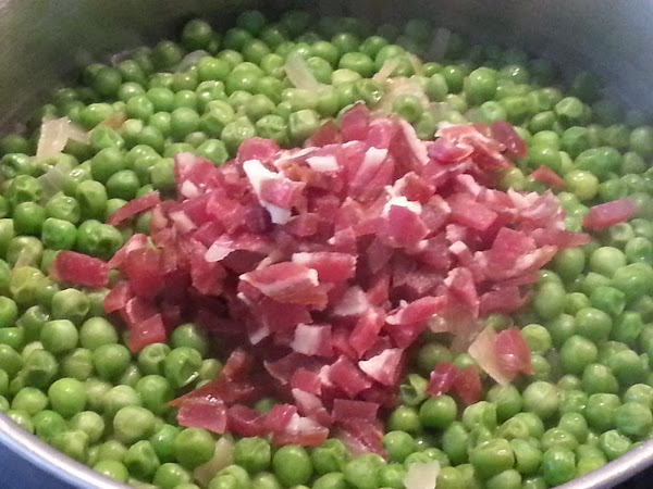 2. - Añadimos los guisantes y añadimos un vaso de agua y dejamos cocer tapado durante 15 minutos.