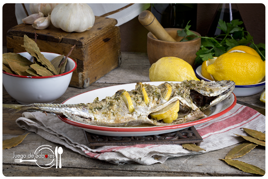 Machacar en el mortero los dientes de ajo sin el germen junto con unas ramitas de perejil. Añadir medio vaso de vinagre, un poquito de agua y un chorro de vino blanco. Echarlo sobre el pescado, añadir un poco de pan rallado por encima y meter en el horno precalentado a 180º con aire durante 25 minutos aproximadamente (siempre dependiendo del tamaño del pescado).