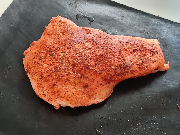 1. - Encendemos el horno a 200º y ponemos la panceta bajo el grifo lo enjuagamos bien, y , sin secarlo, untamos la pieza completa con el pimentón, esta parte hay que hacerla con las manos, para que coja por todos lados.
