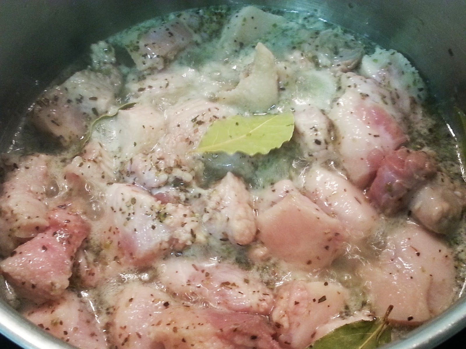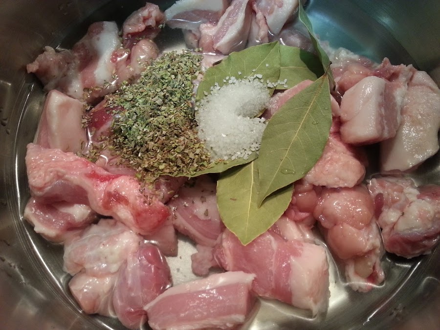 2. - Lo ponemos en una cacerola junto con el laurel, el orégano y la sal, y cubrimos parcialmente de agua.