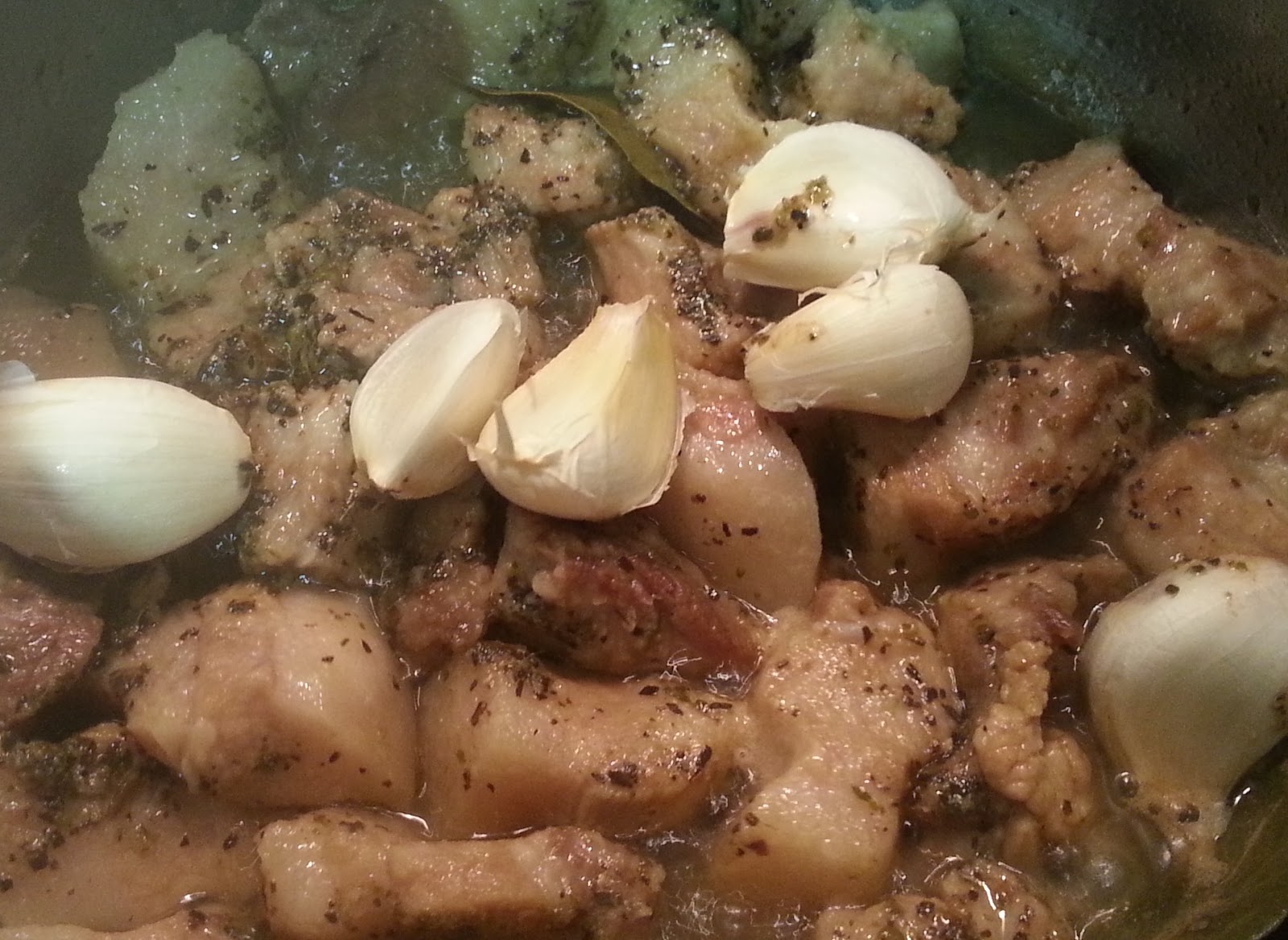 Pasada la media hora, le añadimos los dientes de ajos enteros y sin pelar y le volvemos a añadir agua. Para que vayan soltando toda la grasa.