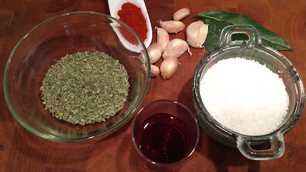 Los "aliños" necesarios para preparar estos chicharrones y la manteca colorá: orégano, Pimentón dulce, ajos, laurel, sal y vinagre de Jerez.