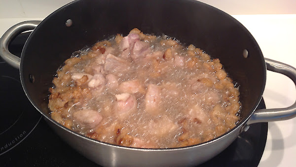 Mientras se derrite la grasa voy troceando la carne. Los trozos deben ser como de bocado.
