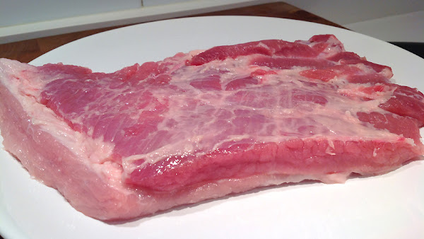 La pieza de panceta fresca, sin piel debe tener el mismo peso (aproximadamente) que la manteca (pella) que vayas a utilizar.