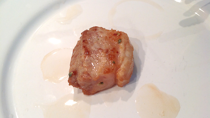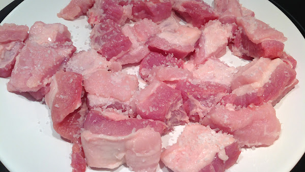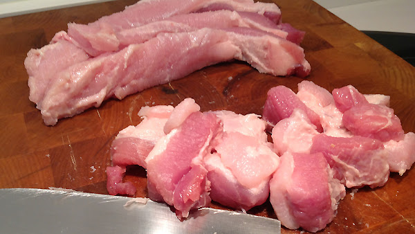 Mientras se derrite la pella, corta la panceta en trozos de un tamaño que después puedas comer de un bocado. Ten en cuenta que tras cocinarlo menguará. Sazona los trozos de carne.