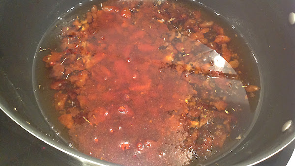 Introduce los ajos machacados, las hojas de laurel, el orégano y la copa de vinagre de Jerez.