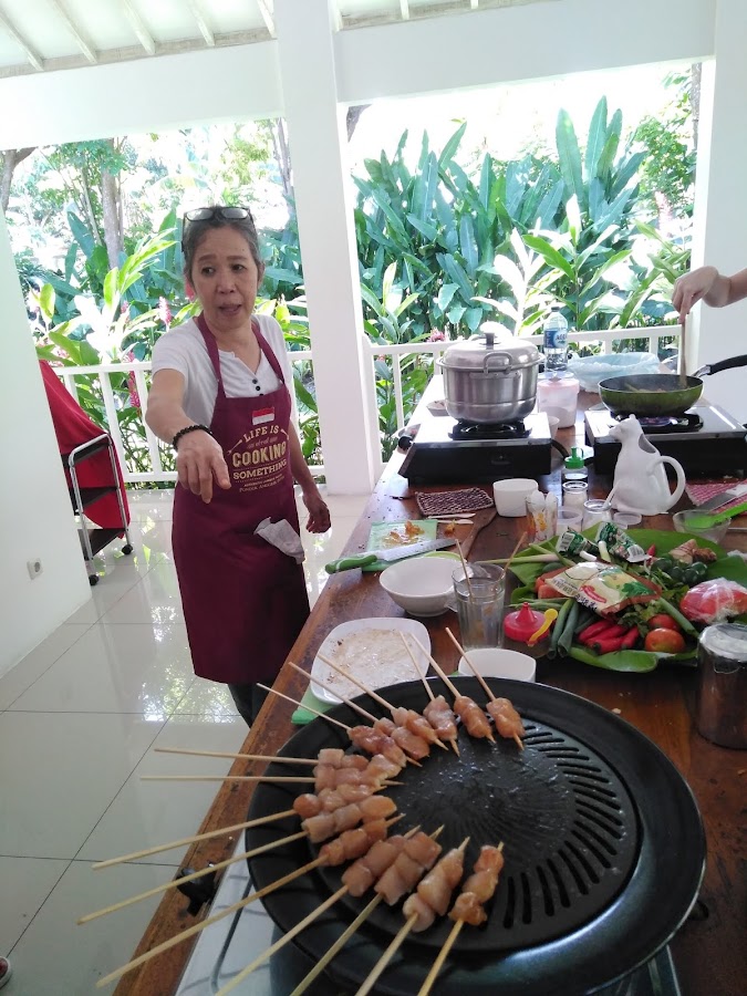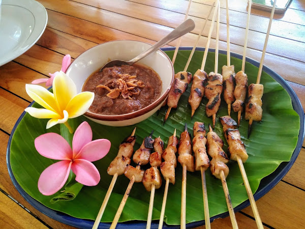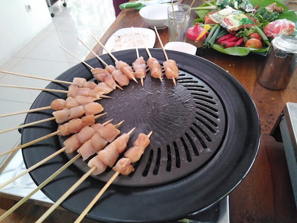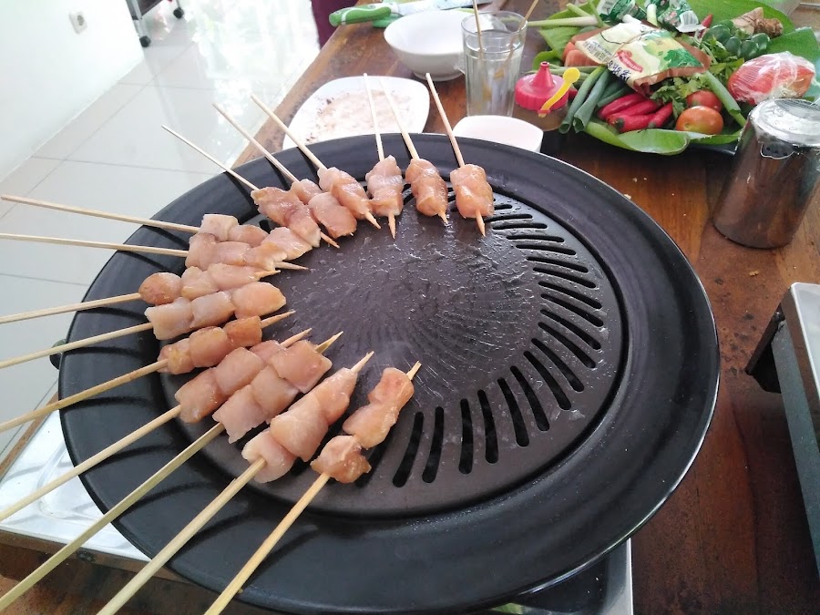 A continuación cogemos los trocitos de pollo y los ensartamos en los palitos de bambú, colocando 4 piezas de pollo en cada uno. Lo cocinamos en una barbacoa o sartén dándolo vueltas continuamente hasta que se doren y estén hechos por dentro. Unos 10 minutos en total.