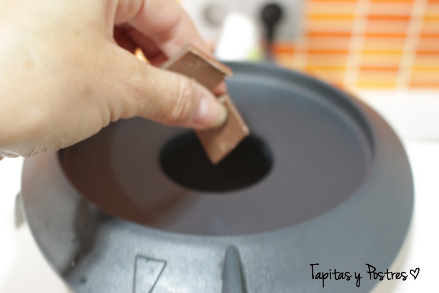 Cuando pasen dos o tres minutos y la nata (crema de leche) ya está caliente añadimos el chocolate con leche troceado por el bocal junto con la mantequilla. Dejamos que acabe y se temple.