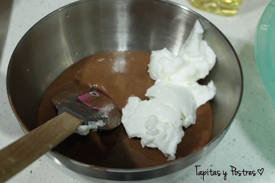 Ahora vamos mezclando poco a poco la masa de cacao con las claras montadas. Despacito y con movimientos envolventes.
