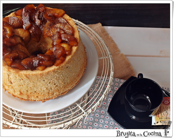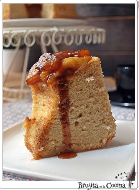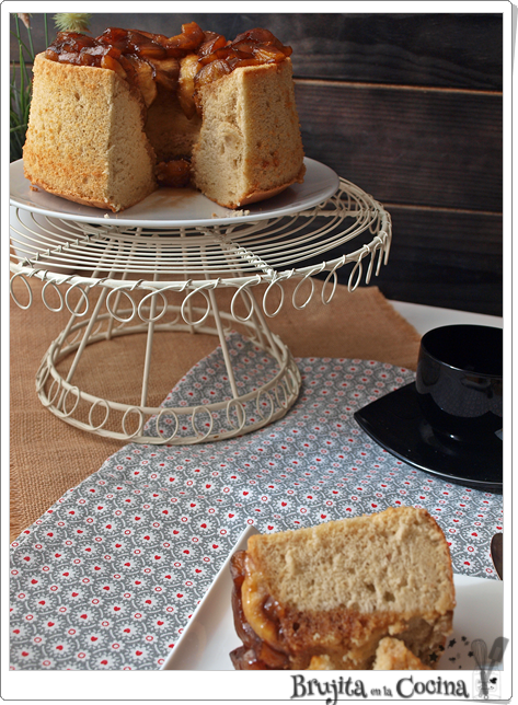 Metemos en el horno precalentado a 170ºC durante 30 minutos, cuando veamos que está doradito y al pinchar sale limpio. Sacamos del horno y damos la vuelta hasta enfriar totalmente (1h) sobre sus patitas o sobre una botella. PAsado el tiempo pasamos un cuchillo alrededor y desmoldamos.