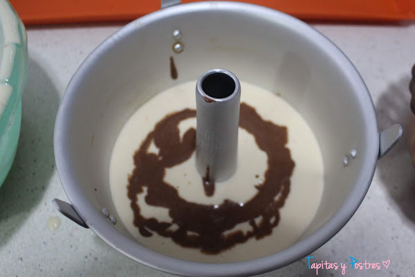 Echamos la masa en el molde. Primero masa de naranja, luego masa de cacao y así sucesivamente hasta que se acaben.