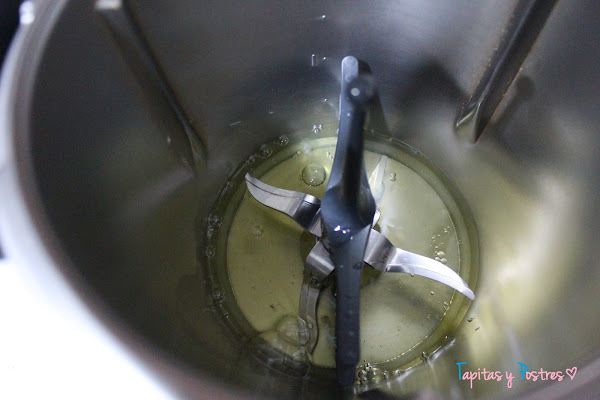 Pondremos la mariposa y programamos 3 minutos a velocidad 3 1/2. Cuando notemos que ya están semi montadas echamos por el bocal un pellizco de crémor tártaro (si lo tenemos) y dejamos que se acaben de montar. Las reservamos aparte y lavamos el vaso. Esto se puede hacer perfectamente con unas varillas eléctricas.