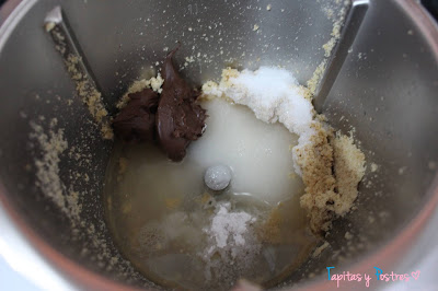 Añadimos la nutella, azúcar, harina, aceite, agua, levadura y sal. Mezclamos muy bien 1 minuto a velocidad 4.