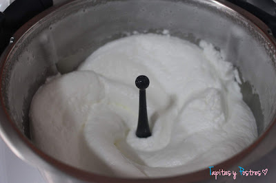 Comenzamos montando las claras en la thermomix (ponemos antes la mariposa). Montar unos cinco minutos a velocidad 3 1/2. A mitad del proceso añadimos el cremor tártaro que lo único que hace es darle firmeza a las claras, si no tenéis se puede obviar.