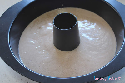 Vertemos la masa en el molde, sin engrasar. Los moldes de chiffon tienen una particularidad no se engrasan porque al salir del horno se ponen boca abajo y se dejan enfriar así. Eso hace que sean muy esponjosos. Lo hornearemos a 180º sin ventilador con calor arriba y abajo durante 40 o 45 minutos. Luego dejamos enfriar con el molde hacia abajo.