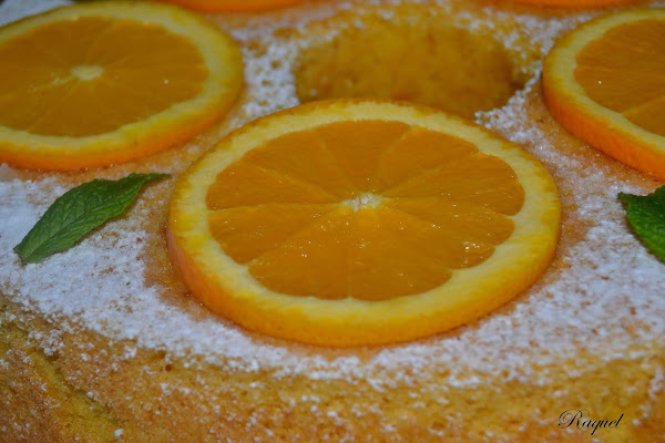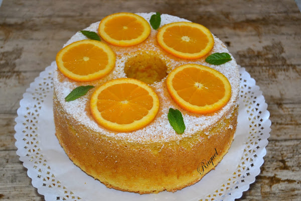 Espolvorea con azúcar glass y corta una naranja a rodajas finas y decora el chiffon, mi idea era ponerle naranja confitada, pero las prisas por hacer este bizcocho no me dio tiempo, ya sabéis como soy yo me viene algo a la cabeza y lo hago, no tengo espera.