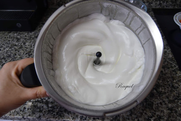 Bate las yemas con la otra mitad de la azúcar, durante cinco minutos al tres y medio, hasta que quede una mezcla blanquecina con mucho volumen.