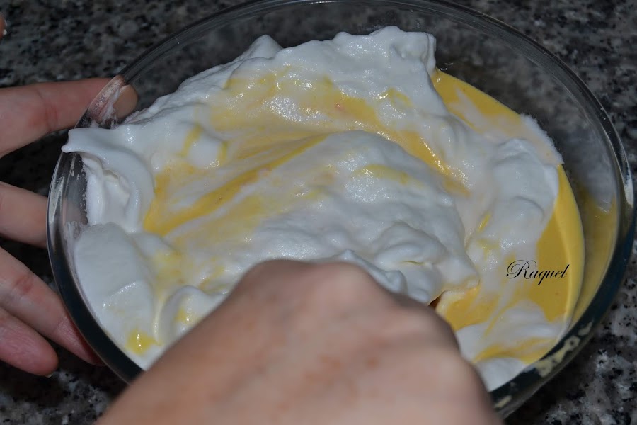 Vierte la mezcla en un bol e incorpora la mitad de las claras y mezcla con la espátula con movimientos envolventes, para que no baje el volumen, incorpora el resto de la clara montada y termina de mezclar.