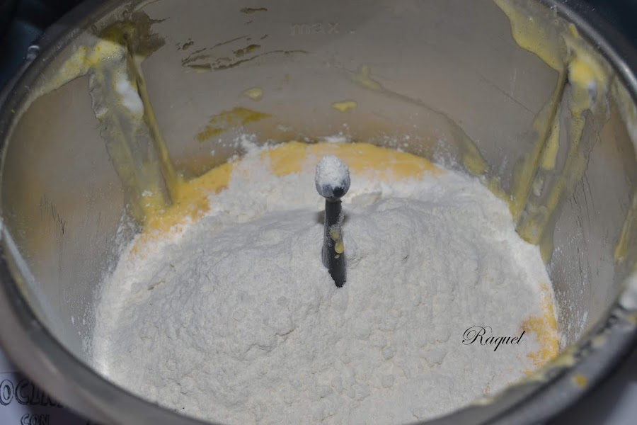 Tamiza la harina, la levadura , la sal y la cascara de las dos naranjas 15 segundos a velocidad 5 a 10 y reserva.