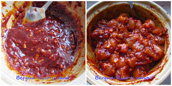 2. Cortamos el pollo en dados y lo impregnamos con la salsa que hemos preparado. Con 2 cucharadas de agua terminamos de limpiar el recipiente de la salsa y lo añadimos al pollo. Reservamos en la nevera durante 10-20 minutos.