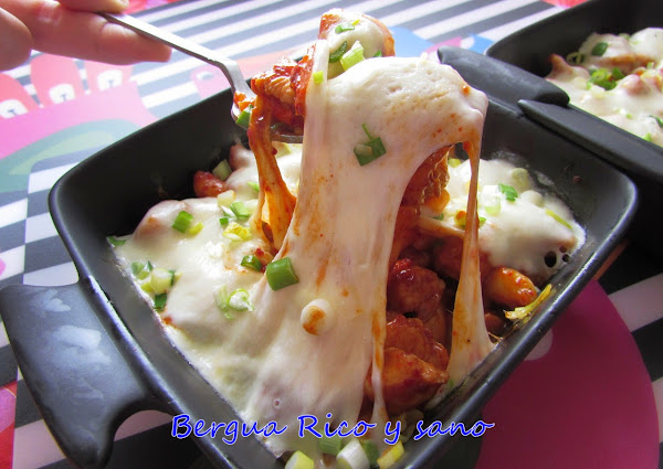 El buldak es un plato de pollo macerado en una salsa picante y es popular en los puestos de comida rápida callejeros de Corea. Hace unos años, algunos restaurantes empezaron a ofrecer este plato con la opción de queso fundido por encima, y es precisamente esa interpretación moderna del plato la que os traigo hoy. "Chijeu" significa "queso" en coreano, "bul" significa "fuego" y "dak" significa "pollo"; ahí tenemos la explicación del nombre ????. Para 2 comensales: