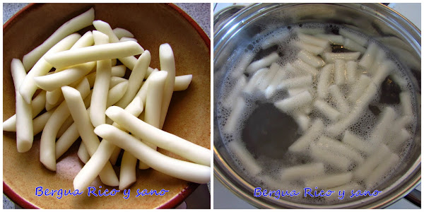 Opcional, como acompañamiento y para enriquecer la textura del plato, se pueden elegir 130 g de: pastel de arroz coreano (tteokbokki tteok; es lo que yo he usado hoy); tallarines de boniato coreanos (son grisáceos cuando están secos) y se parecen a los soba japoneses; tallarines udon o tallarines celofán, que quedan transparentes al cocinarlos.