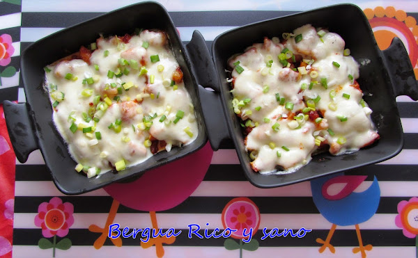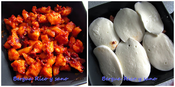 6. Servimos entonces el pollo en una cazuelita apta para horno y coronamos con el queso. Le vamos a dar unos 5-10 minutos a 200º en el horno precalentado. Queremos que el queso se derrita. Si os aguantáis, dejad también que el queso tome algo de color. A mí me venció la impaciencia y lo saqué cuando todavía estaba bastante blanquito.