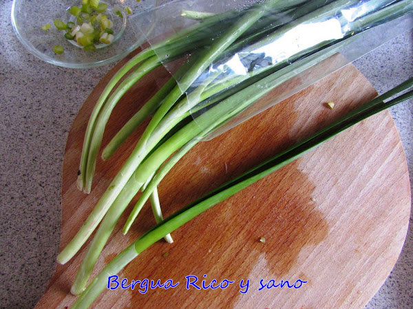 7. Mientras se funde el queso, cortamos finito el cebollino y/o la cebolleta, que añadirán color y frescura al plato. Yo usé una de cebollino y una de cebolleta.