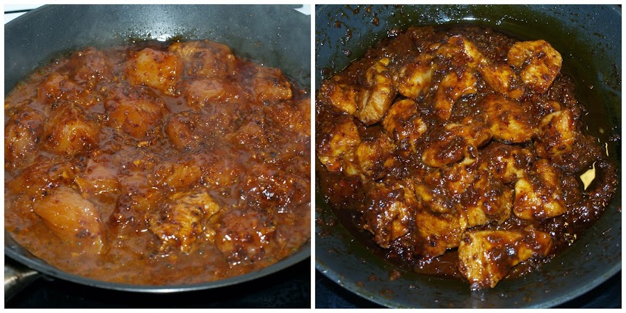- Cortamos las pechugas de pollo en trozos y las ponemos con las cubrimos con la salsa. Asegurándonos de que se impregnan bien por todos lados. Las dejamos marinando 10 - 20 minutos.