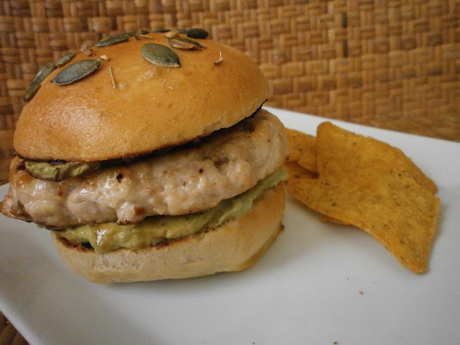 Chiken burger con salsa di avocado e chips di tortilla-Chiken burger con salsa de aguacate y chips de tortilla