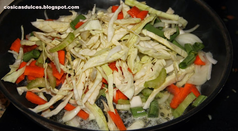Cortamos toda la verdura en juliana y la sofreimos en una sartén con mantequilla sin dejar de mover.