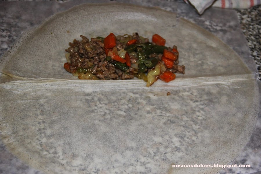 Cuando esté todo bien cocinado añadimos la cucharada de harina. Mantenemos en el fuego un par de minutos más y después retiramos. Ponemos una cantidad generosa de relleno sobre la masa brick y liamos con forma de rollito.