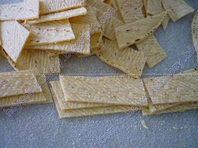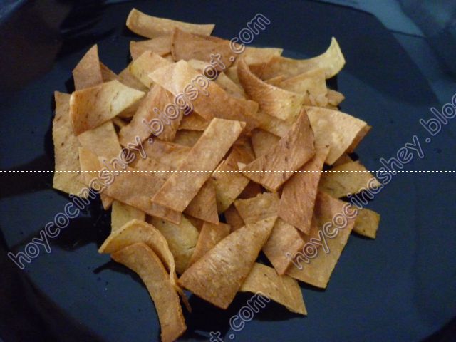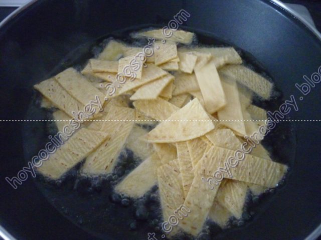 Empezamos por cortar las tortillas en tiras y de preferencia que sean de días anteriores así sera mas fácil dorarlas:
