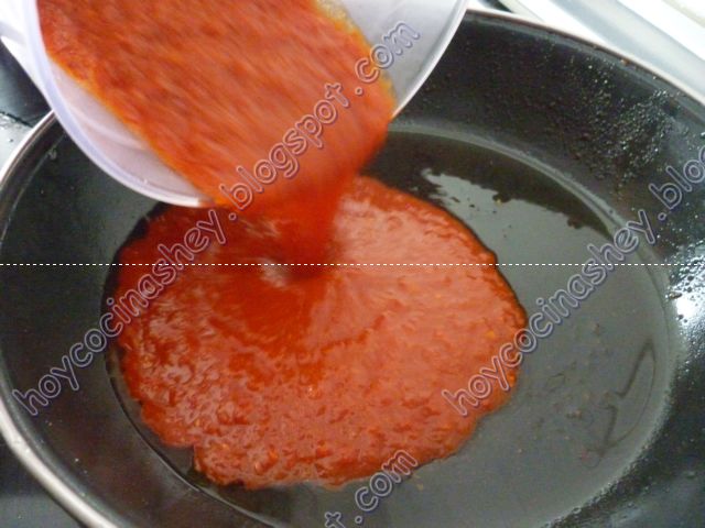 Ponemos a remojo los chiles guajillos en agua caliente, cuando este listo lo pasamos a la licuadora junto con el jitomate, la cebolleta, ajo trituramos y reservamos: