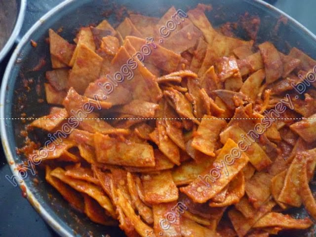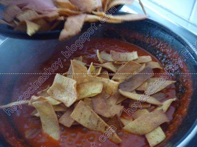 Dejamos que empiece a hervir y que reduzca unos 5 minutos y agregamos los totopos: