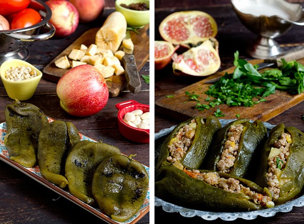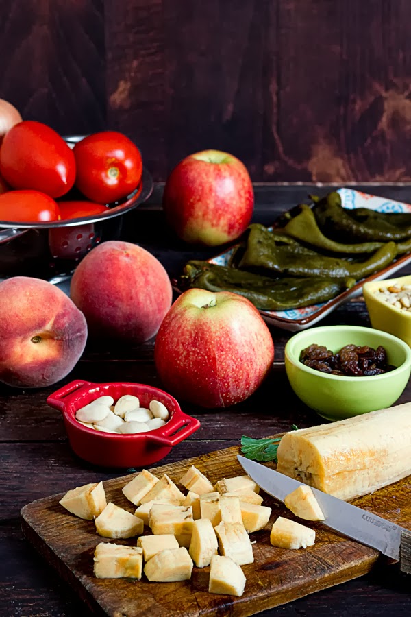 Básicamente éste plato consiste en un chile poblano, que es un pimiento carnoso y con un punto ligero picante muy agradable, que se rellena de carne de cerdo y ternera, en mi caso he utilizado solo cerdo, mezclada con distintas frutas, como la manzana, plátano macho, melocotón y frutos secos como las pasas, piñones y almendras y regada con una salsa semidulce, la nogada, cuyo principal ingrediente son las nueces, de ahí su nombre.