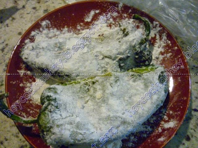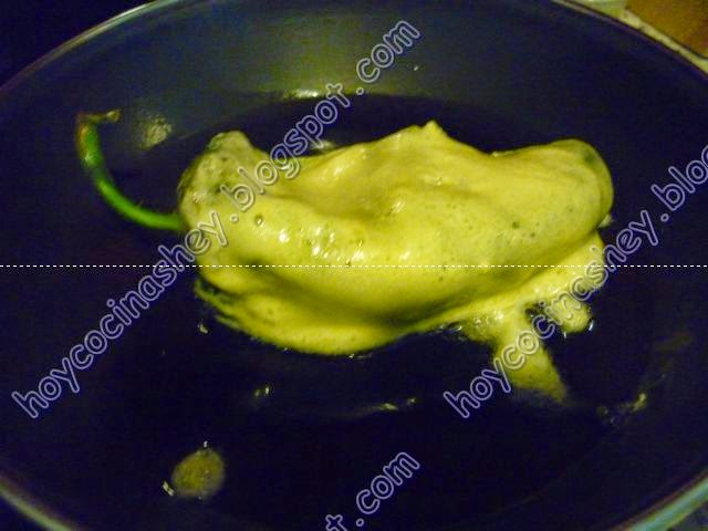 Capeamos los chiles con la mezcla de huevo y directo a la sarten con aceite caliente; Este paso es el mas fácil ya freímos el capeado por los dos lados:
