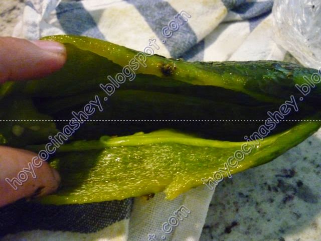 A continuación retiramos la piel y lavamos o nos ayudamos con un trapo húmedo a retirar los restos que pudieran quedar, así como las semillas y venas para evitar que piquen: