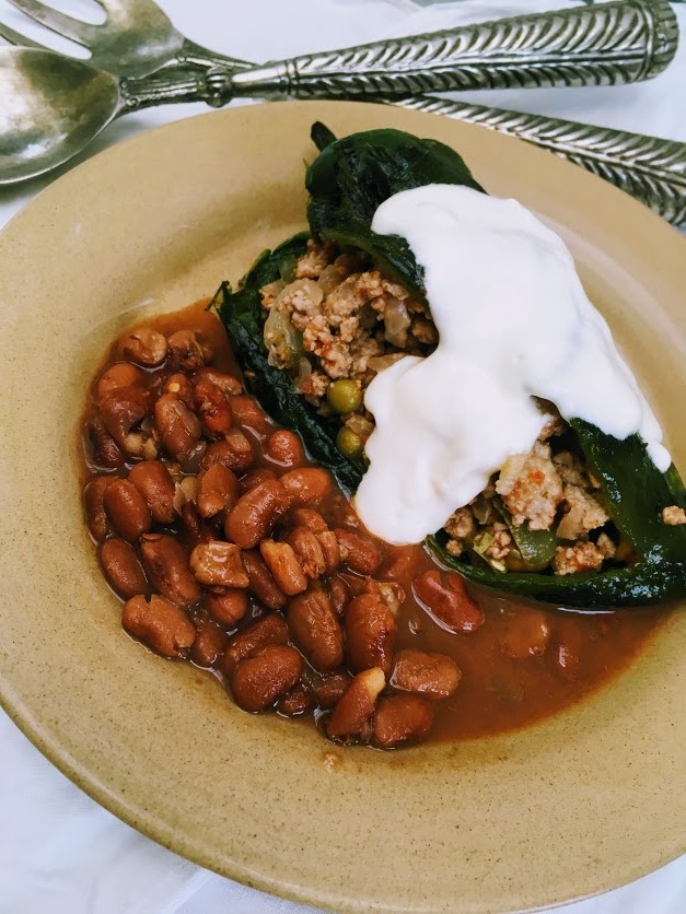 Por la apertura que le hice al chile para limpiarlo lo relleno con el picadillo, si son muchos los pongo en una charola (fuente) de horno; si solo voy a servir los 5 chiles los monto en platos y los caliento en microondas, los baño con crema de leche y los acompaño con frijoles charros o arroz