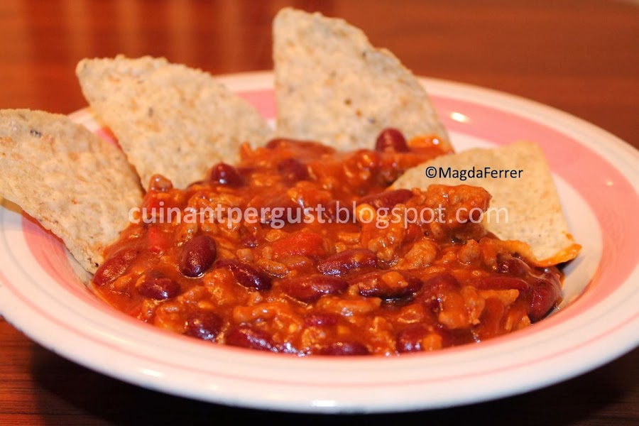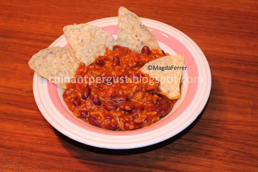 Dorar la carne junto con la cebolla, el ajo y el pimiento troceado. Añadir el curry, el pimentón, el laurel y la cayena en rama desmenuzada. Salpimentar al gusto. Remover hasta que la carne esté dorada y agregar el tomate y el kétchup junto con el azúcar para restarle acidez al tomate. Remover para que todos los ingredientes se integren y añadir las alubias y el caldo que las acompaña. Dar unas vueltas y rectificar de sal y picante si es necesario. Bajar el fuego y dejar cocer para que espese. Servir acompañado de unos triángulos de maíz.