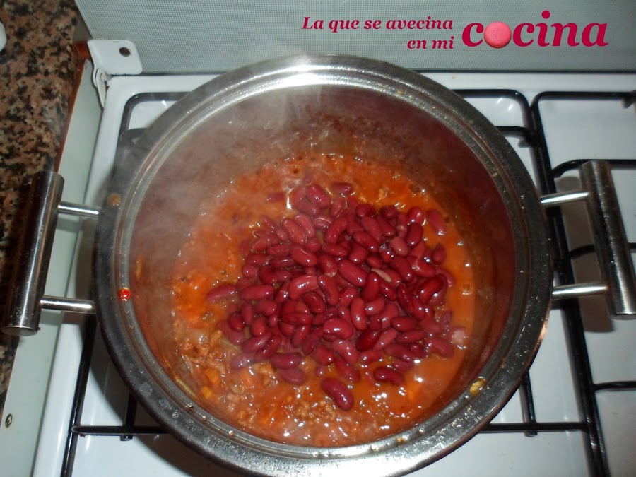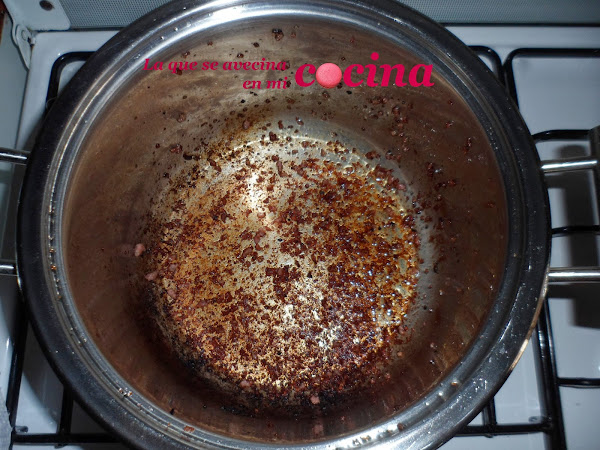 No lavéis ni cambiéis la cacerola porque se os quede oscurita como podéis ver en la foto que os dejo abajo. Eso no es quemado, es simplemente la esencia de la carne que se ha quedado pegadita en la cacerola. De esta manera si seguimos haciendo el chili en la misma cacerola que hagamos la carne, obtendremos mucho más sabor porque no perderemos nada del "juguito" que desprende al hacerse. No os preocupéis que conforme vayamos haciendo el resto del chili, ese fondo oscurito se irá desprendiendo poco a poco y nos ayudará a potenciar el sabor de nuestro chili con carne.