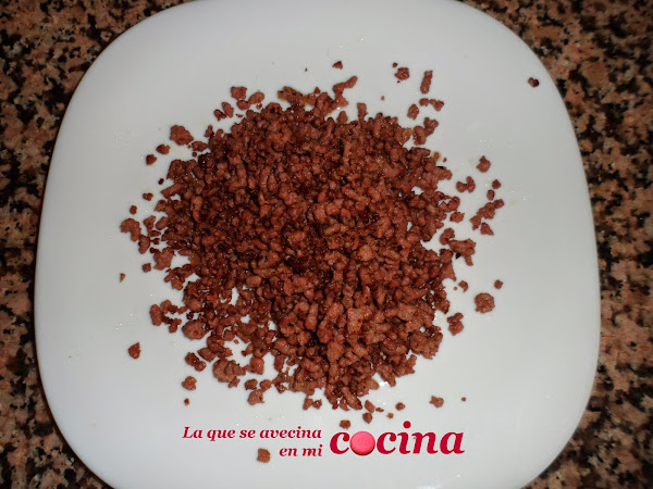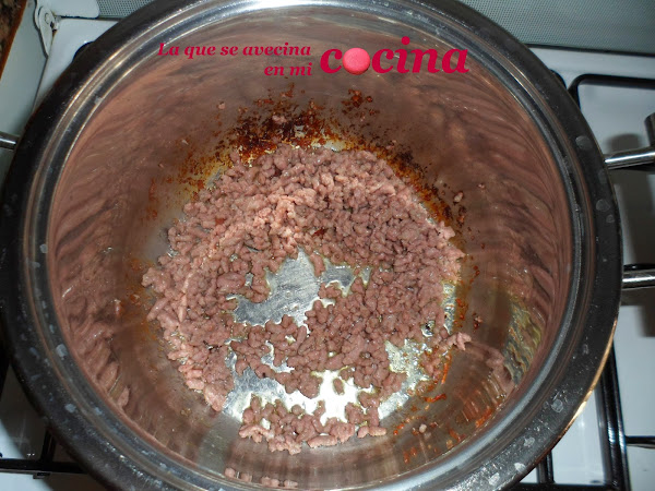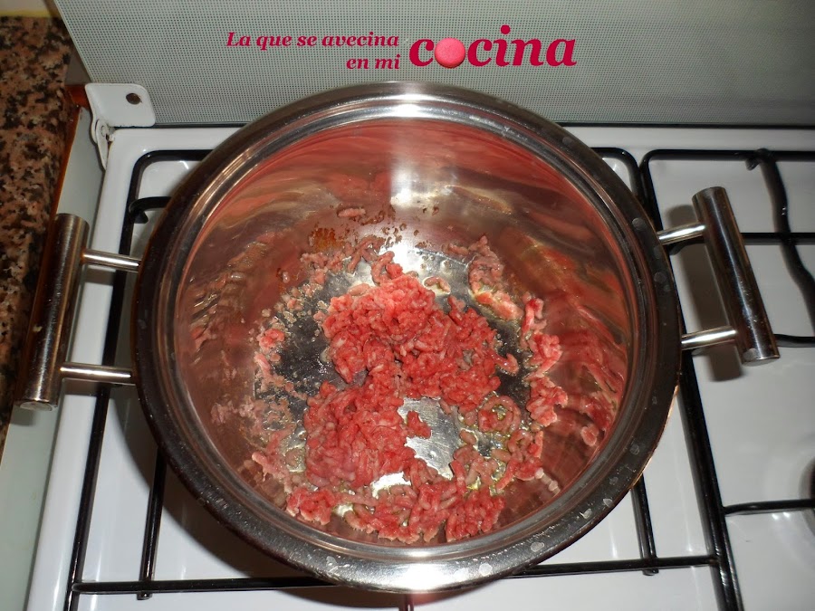 Queremos conseguir una carne bien desmenuzada, casi como si fueran granitos de arroz, y bien doradita, casi marroncita. Para ello es mejor ir dorándola poco a poco, es decir sin echar de sopetón toda la carne. Por eso yo la divido en tres partes y voy echando una a una. Primero echo una parte, la doro y la reservo en un plato, luego la segunda parte y lo mismo y así hasta que termino de dorar toda la cantidad. Eso sí, cada vez que termino una parte añado un poquito más de aceite de oliva a la cacerola.