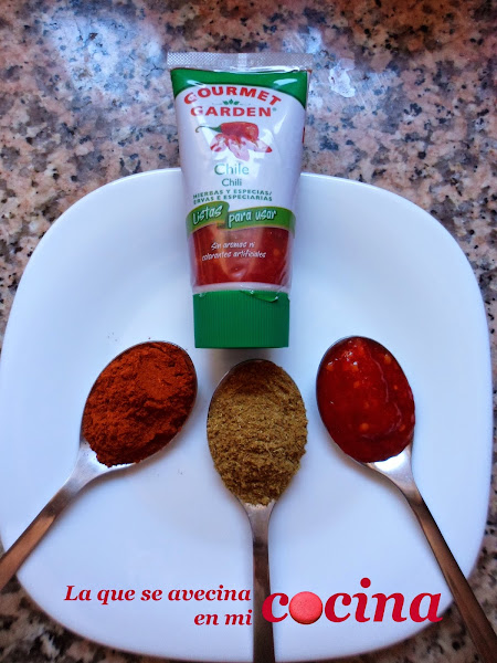Además al ser unas hierbas y especias en pasta, se conservan super bien en el frigorífico y son muy cómodas puesto que no tienes que picar nada, solamente echar la cantidad deseada del tubito y listo, a guardarlo de nuevo en la nevera. Vamos todo un invento. Así que decidida cogí mi tubito de chili, el resto de ingredientes y manos a la obra jajaja.